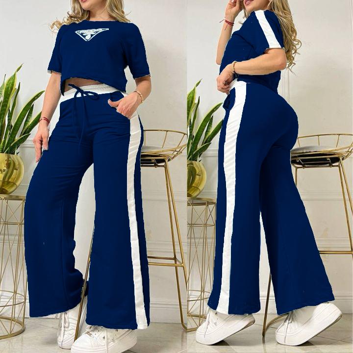 Conjunto cómodo y moderno de dos piezas, ideal para un look casual con estilo. 🖤 Diseño con franjas laterales que estilizan la silueta y top tipo crop con detalle estampado. ✅ Tela suave, fresca y con excelente elasticidad.